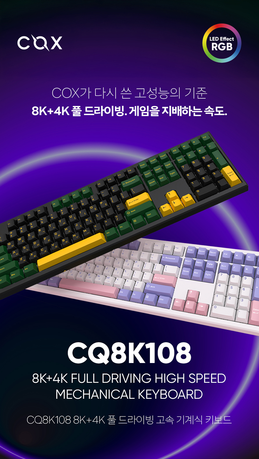 확실히 요즘 출시되는 풀 배열 기계식 키보드답게 웬만한 기능들은 전부 탑재되어 있습니다. 블루투스, 2.4G 동글, 유선까지 모든 연결 모드를 지원하며, 연결 OS도 가리지 않습니다. 기본적으로 풀 배열 키보드이기 때문에 다양한 환경에서 사용할 수 있고, 유선 8K + 무선 4K 폴링레이트를 지원하기 때문에 FPS나 리듬 게임 등 게이밍 키보드로서의 스펙도 상당히 충실하게 갖추어져 있습니다. 보통 요즘 출시되는 8K 지원 키보드들을 살펴보면 단순히 8K를 지원한다는 설명에 그치는 경우가 많습니다. 하지만 이번 CQ8K108 키보드의 경우, 아예 PCB 설계까지 COX에서 참여했을 만큼 다른 8K 지원 키보드들 대비 공을 많이 들였다고 말씀드릴 수 있습니다. 하우징 자체의 디자인이나 설계가 깔끔하면서도 전체적인 높이도 낮아, 사용하는 측면에서도 편하게 쓸 수 있으며 타건 소리 측면에서도 좋은 결과를 낼 수 있도록 만들어져 있습니다. 요즘은 가성비 키보드들이 많이 출시되는 수준을 넘어, 8K 폴링레이트를 지원하면서도 가성비를 챙기는 제품들이 많이 나오고 있습니다. 이번 COX의 CQ8K108은 그중에서도 최신 키보드답게 깔끔한 퀄리티와 성능을 보장하면서도 가성비까지 잘 챙겨주는 아주 괜찮은 키보드라고 말씀드릴 수 있겠습니다.