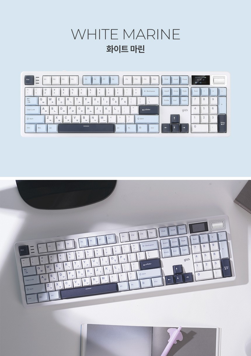 WK107 8K 풀 배열 키보드는 부담 없이 접근 가능하면서도 감각적인 키감과 색감을 제안하는 지클릭커의 첫 번째 ‘파도 프로젝트’ 제품입니다. 지클릭커에서 이 제품에 상당히 심혈을 기울인 듯한 느낌을 받았습니다. 전체적인 하우징 디자인이나 컬러웨이까지 꽤 깔끔하게 잘 나왔고, 요즘 가장 트렌디하다고 할 수 있는 다소 단단한 ‘폼떡’ 세팅으로, 너무 무르지 않은 적당하고 재미있는 구조 세팅이 인상적이었습니다. 게다가 다른 기성품 기계식 키보드에서는 볼 수 없었던 신선하고 매력적인 구성들이 돋보였습니다. 예를 들어, LCD 스크린을 탈착하여 일반 키를 배치해서 사용할 수 있는 기능, 그리고 일반적인 볼륨 조절 노브 대비 훨씬 사용하기 편리한 노브 구성 등이 상당히 인상적이었습니다. 요즘은 정말 다양한 브랜드에서 기본기도 좋고 가격도 저렴한 플라스틱 하우징의 기계식 키보드를 많이 출시하고 있습니다. 이번 지클릭커의 WK107 8K는 그중에서도 지클릭커만의 특별한 매력을 가지고 있어 다른 브랜드 제품 대비 충분히 경쟁력을 갖추고 있다고 생각합니다. 풀 배열 키보드를 구매하려고 알아보시는 분들에게 이번 WK107 8K도 충분히 매력적인 제품으로 추천하고 싶습니다.