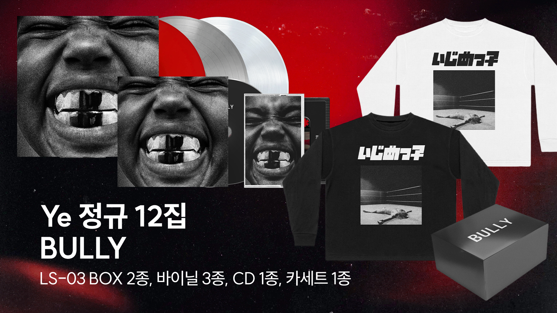 2024년 내한 공연 직후부터 쭉 예고되어 왔던 예의 열두 번째 솔로 스튜디오 앨범, [BULLY]는 지금까지 수 차례의 수정과 발매 연기를 통해 팬들의 이목을 끌어 왔던 프로젝트입니다. 일본에서 예 홀로 작업한 곡들을 기반으로 만들어진 본작에는 커리어 초기의 분위기를 떠올리게 하는 샘플링 기반의 프로덕션과 프로레슬링에 영감을 받은 독특한 비주얼 테마가 어우러져 있습니다. 2021년 [Donda] 이후 본격적으로 발매되는 첫 솔로 스튜디오 앨범인 [BULLY]의 실물 음반을 이번 래플을 통해 손에 넣어 보세요!